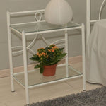Silene Satin Weiß gebogener Nachttisch Eleganter Schmiedeeisen am Nachttisch mit zwei Kristallregalen. Eigenschaften: Schmiedeeisen. Satin weiße Farbe. Misst L 52 x P 35x72 H cm. Höhe vom Boden Erstes Regal 15,5 cm. Höhe vom Boden...
