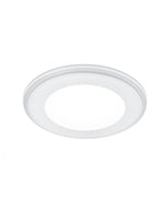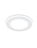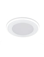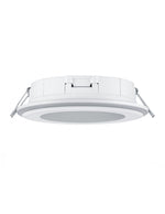 Das eingebundene runde Scheinwerfer der Serie AURA Von Triobeleuchtung Es besteht aus undurchsichtigem weißem Kunststoff mit seitlichen Flügeln, die die Installation in Gipsboard -Spemandecken erleichtern.