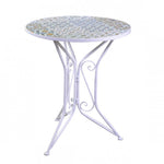 Schmiedeeisentisch mit Mosaik und Stühlen Aus Schmiedeeisen gemacht Mit Keramikoberteil Mosaikeffektsitz; Mosaik zurückgezogen; Tabelle CM Ø 60 Höhe: 71 cm Stuhlgröße: Länge: 55 cm; Tiefe: 40 cm; Armlehnenhöhe: 45 cm; Gesamthöhe: 90 cm