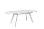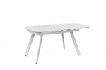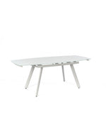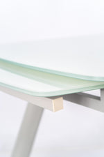Die generische Größe der Tabelle beträgt 90 cm x 140/175/210 cm H. 76 cm und bietet ausreichend Platz, um bis zu 8 Personen bequem aufzunehmen. Das extra weiße, temperamentvolle Glasoberteil verleiht dem Tisch ein elegantes und modernes Aussehen, während die hellgrau lackierten Metallbeine einen Hauch von Verfeinerung verleihen.