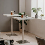 Hochquadratisch Tisch H.105 cm weißer Oberteil und Chrombasis