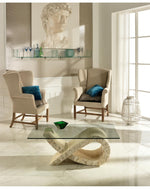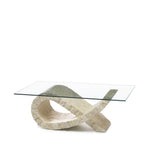 Der Tisch zeigt ein Oberteil in getempertem, poliertem Gewinde, das nicht nur ein elegantes Erscheinungsbild verleiht, sondern auch eine resistente Oberfläche und leicht zu reinigen bietet. Die Beine und die Basis bestehen aus weißem Agata -Fossilstein, was dem Tisch einen Hauch von Verfeinerung und Stabilität verleiht.