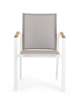 Aluminiumstruktur, pulvermalt (Polyester). Armlehne mit Teakläufen. Sitz und Rücken mit Textilene Phifer 1x1 bedeckt. stapelbar.