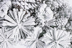 Schneebedeckt. Metallstruktur. Material der Nadeln für Injektion und PVC, gedruckt mit Kiefernkegeln. Pinseleffekt Zweige, die die Struktur der Kiefernnadeln reproduzieren.
