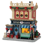 Der Friseurladen in East Village ist der eleganteste Ort, an dem man verwöhnt werden kann. Dieses zweistöckige rotes Backsteingebäude verfügt über einen klassischen Friseurladen im Erdgeschoss. Durch das beleuchtete Schaufenster des Ladens können Sie den Friseur sehen, der die Haare einem Gentleman schneidet. Auf der Veranda befindet sich eine Bank der Bushaltestelle, einen Laternenpfahl und einen Mann, der als Weihnachtsmann gekleidet ist, der einen großen Stapel Zeitungen verkauft.