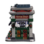 Das erleuchtete Fenster zeigt die raffinierten Produkte für Haustiere des Geschäfts, während noch mehr Betten und Spielzeuge auf der vorderen Veranda ausgestellt werden.