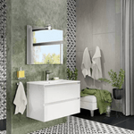 Hängsbadschrank, ausgestattet mit zwei 80 -cm -Truhen Schubladen mit gepolsterter Schließung. Die Spüle ist Keramik. Der Spiegel ist im Preis enthalten.