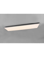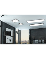 Die Deckenlampe Alpha Von Triobeleuchtung Es hat eine rechteckige Struktur aus Metall mit Aluminiumkante und weißem Diffusor.
