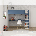 Schlafzimmer 2276 mit Mezzanine -Bett mit darunter liegenden weißen und blauen Schreibtisch