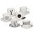 Die Tassen und Untertassen sind weiß mit abstrakten schwarzen Dekorationen.