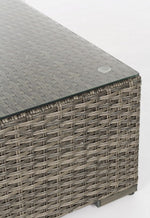 Aluminiumstruktur, gestrichenes Pulver (Polyester), synthetische Faserverflechtung. Temperiertes Glasoberteil. verstellbare Füße.